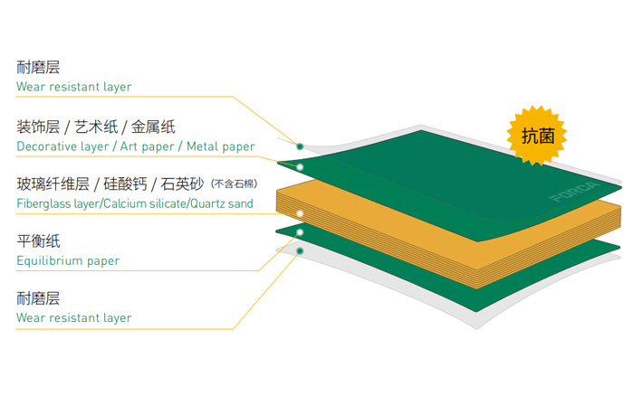 • 福爾卡?醫(yī)耐板?(玻纖復(fù)合不燃板)是由耐磨層、裝飾層、玻璃纖維層、硅酸鈣、石英砂(不含石棉)和平衡紙,表面經(jīng)過(guò)三聚氰胺樹脂與特種改性樹脂浸漬層疊后高溫高壓而成,產(chǎn)品的密度不低于1650KG/m3,厚度從4mm 到12mm,形成了整體A級(jí)防火、密度高、硬度高、表面毛孔很小的纖維板。
